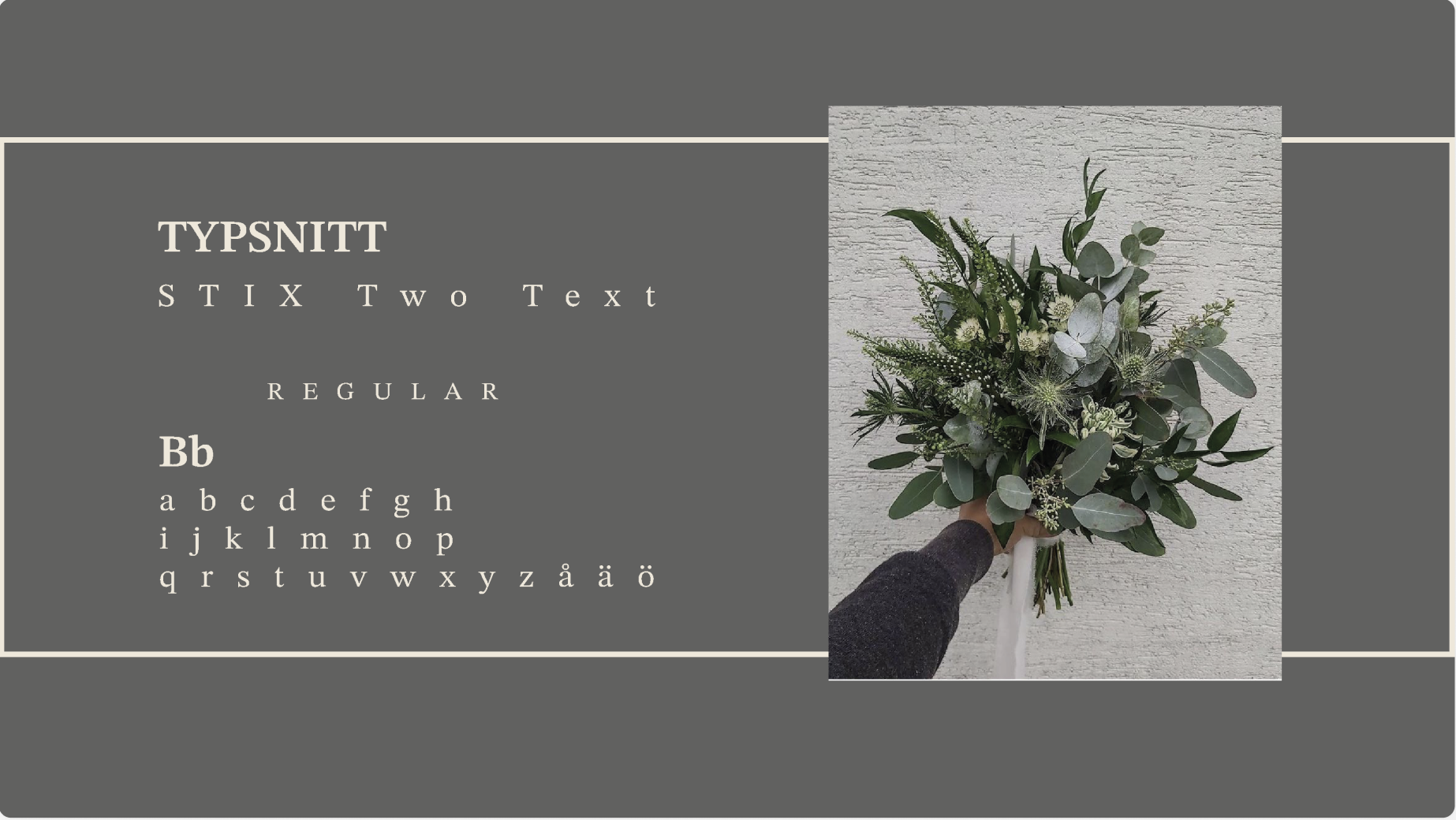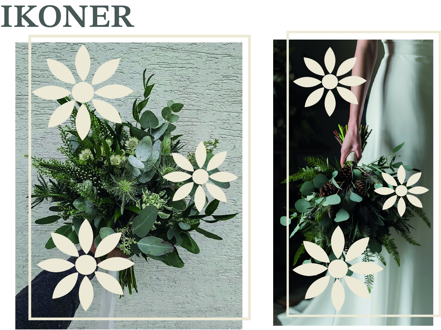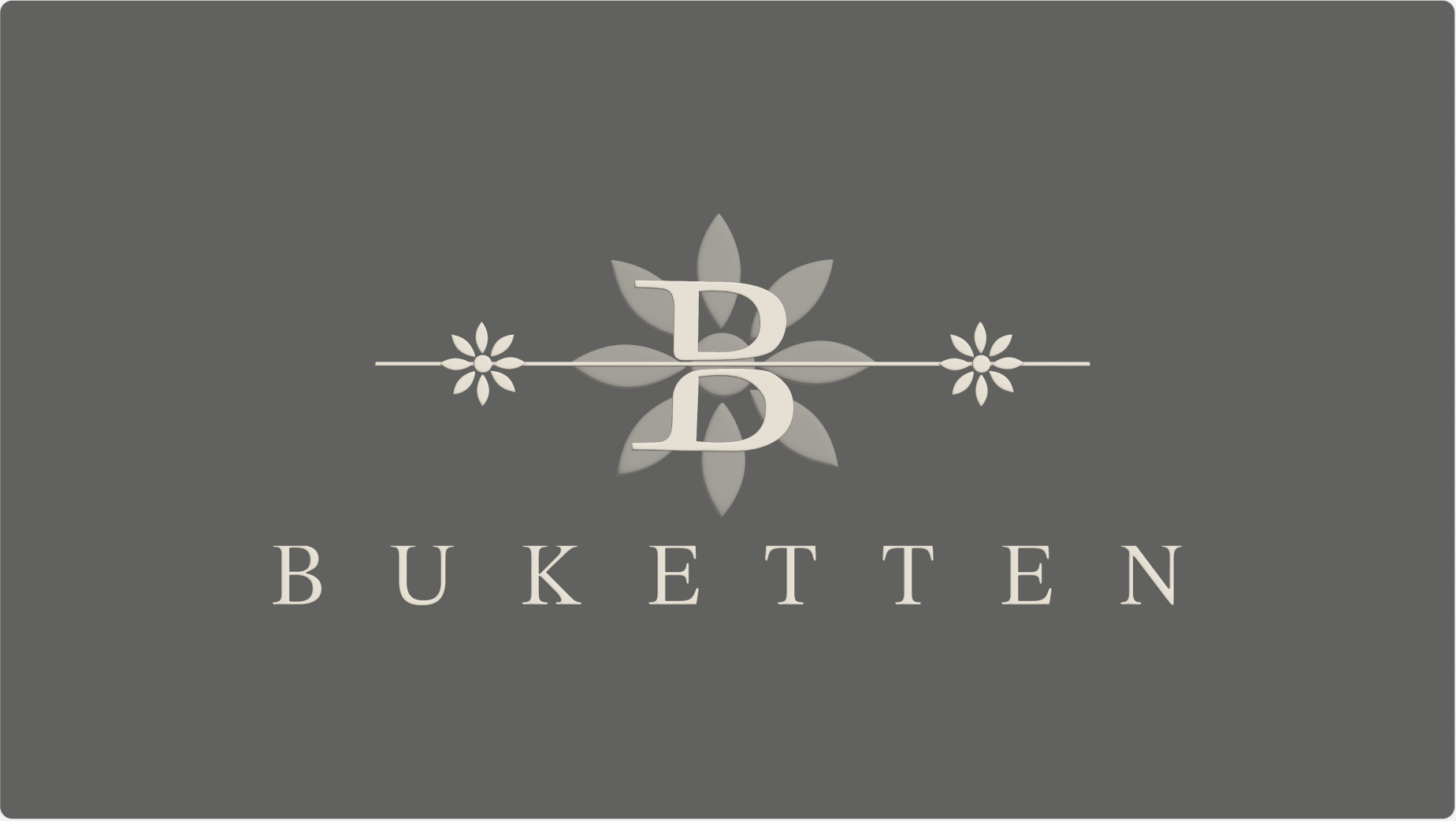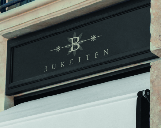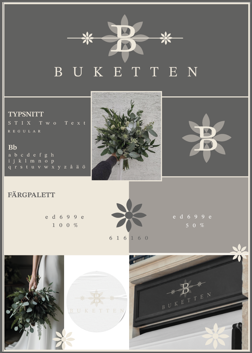 En grafisk profil för blomsterbutiken Buketten. Jag har valt att ta bort den rosa och blå färgen i den ursprungliga loggan och istället ha en stilren och elegant beige nyans. Jag valde att behålla B:et i buketten så som originalloggan har men ändrade till en versal och formade om den i en egen design. Jag lät även blomman i bokstaven bestå men i en större version och med transparant beige så att bokstaven fick vara den tydliga punkten i loggan. Igenom B.et har jag ett lagt ett streck med bestående mindre blommor som väger upp loggan.